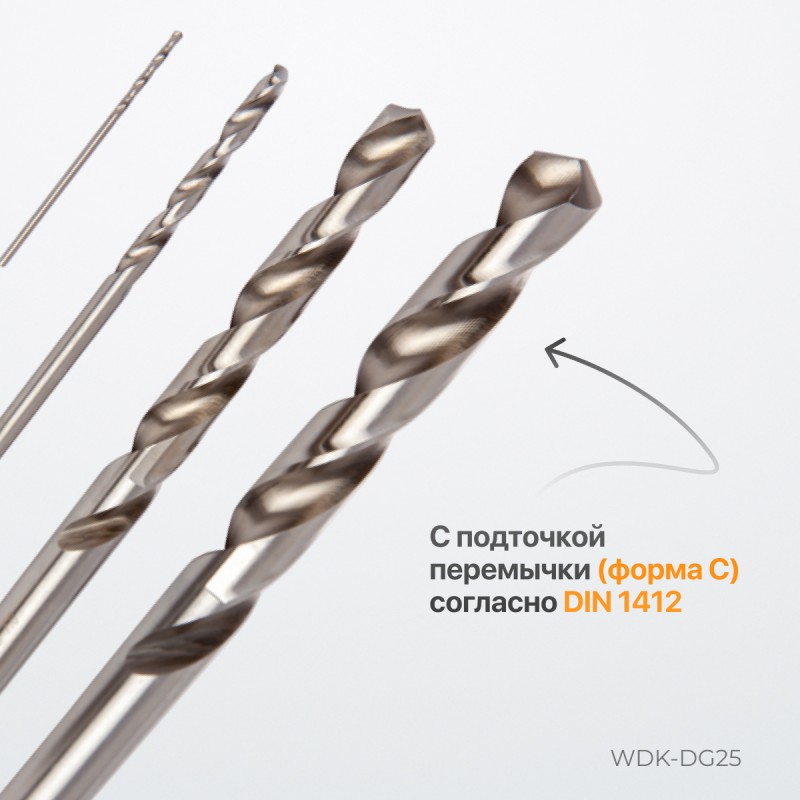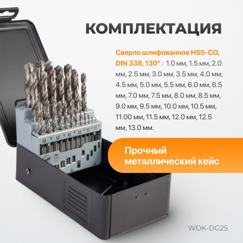 Набор сверл по металлу WDK-DG25 1-13 мм, шаг 0,5 мм, HSS-G, 25 предметов, металлический кейс.